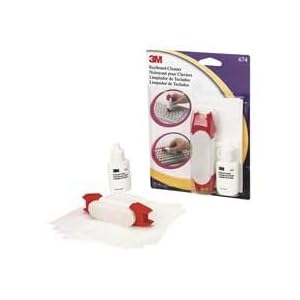 The 3M Keyboard cleaner kit has a scrubbing tool designed to remove dirt from keys and fits into hard-to-reach places on keyboards, fax machines, etc. It also has a cleaning solution which helps cut through grime, grease, fingerprints. The kit includes 4 finishing cloths.